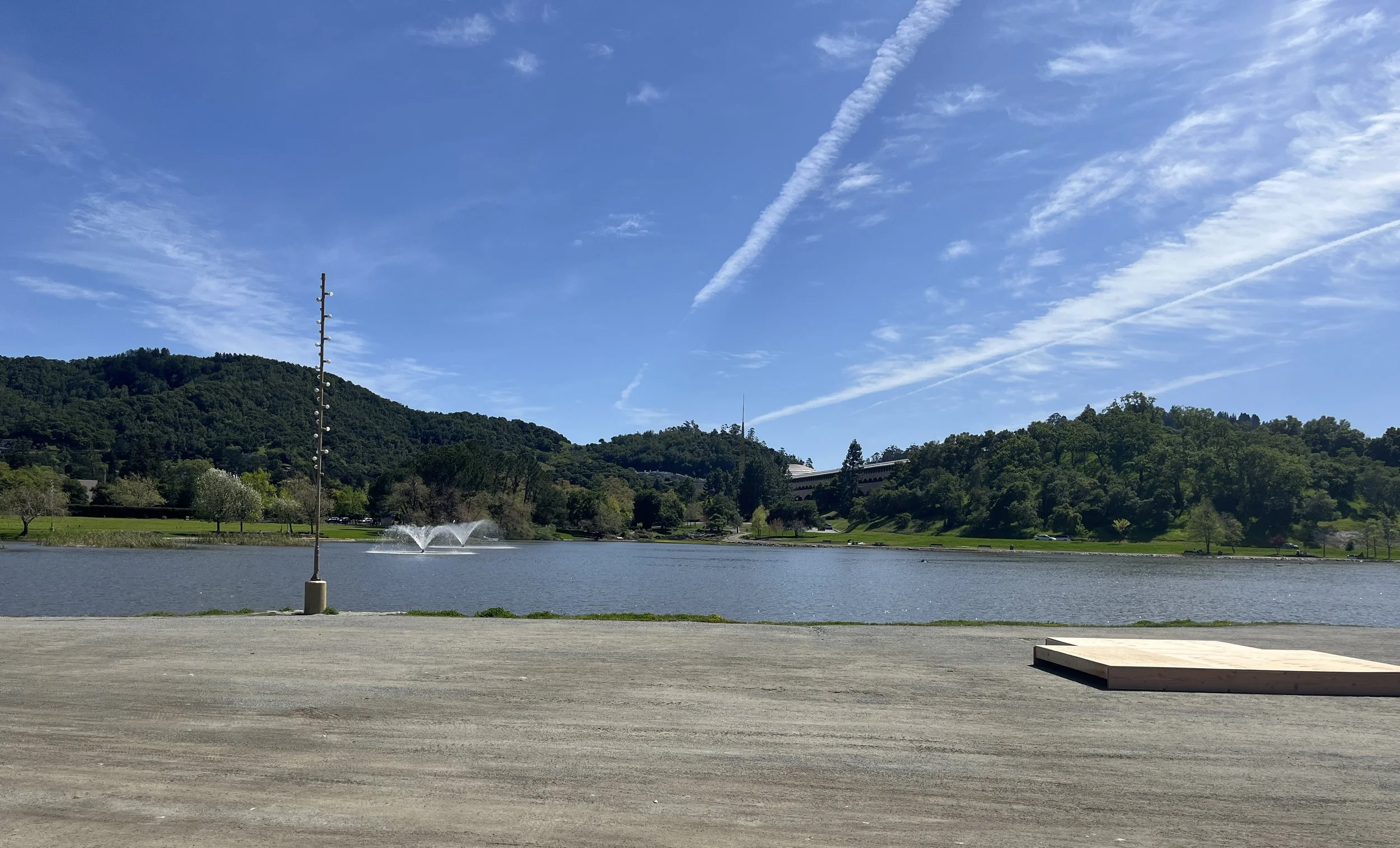 This is what the event location looks like. Head toward the lagoon on the paved lot from either adjacent parking lot.